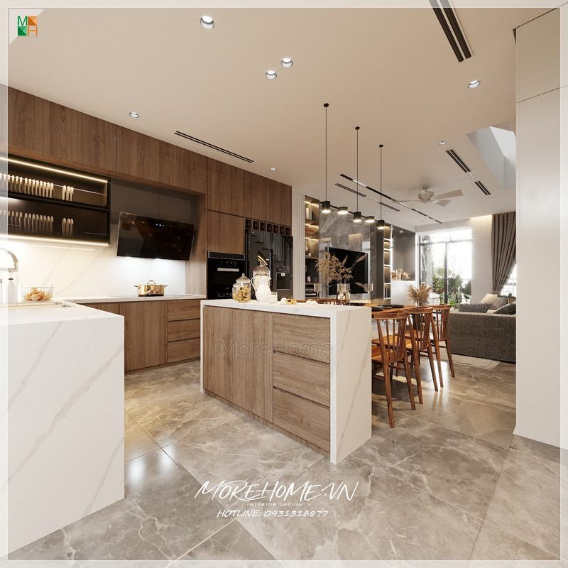 Thiết kế bếp rất khoa học có đảo bếp đa năng tiện lợi cho việc sinh hoạt và rất sang trọng