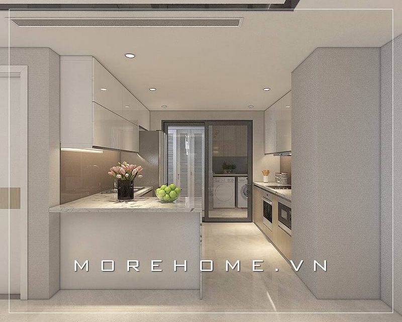 Thiết kế nội thất phòng bếp chung cư với tone màu trắng hiện đại tạo nên không gian thoáng mát và sạch sẽ hơn