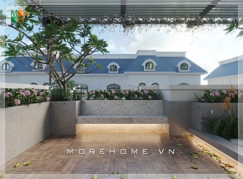 Thiết kế biệt thự có sân thượng đẹp bố trí hoa, cây xanh tươi mát là không gian sinh hoạt ngoài trời độc đáo đem lại những cảm giác mới lạ.
