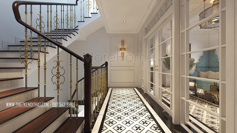 Cầu thang tân cổ điển có phần chiếu tới dài rộng với nhiều họa tiết cực thu hút.